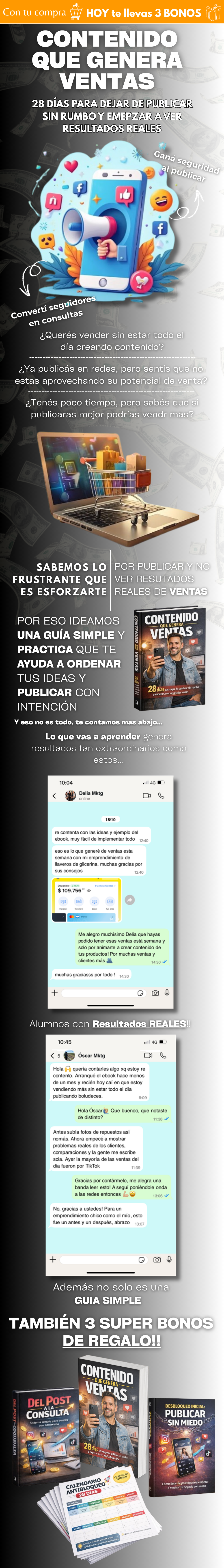 “Publicaba todos los días y no vendía nada.” Con Contenido que genera ventas entendí qué decir, cómo decirlo y cuándo publicar. En menos de 2 semanas cerré mis primeras ventas por Instagram sin usar anuncios.